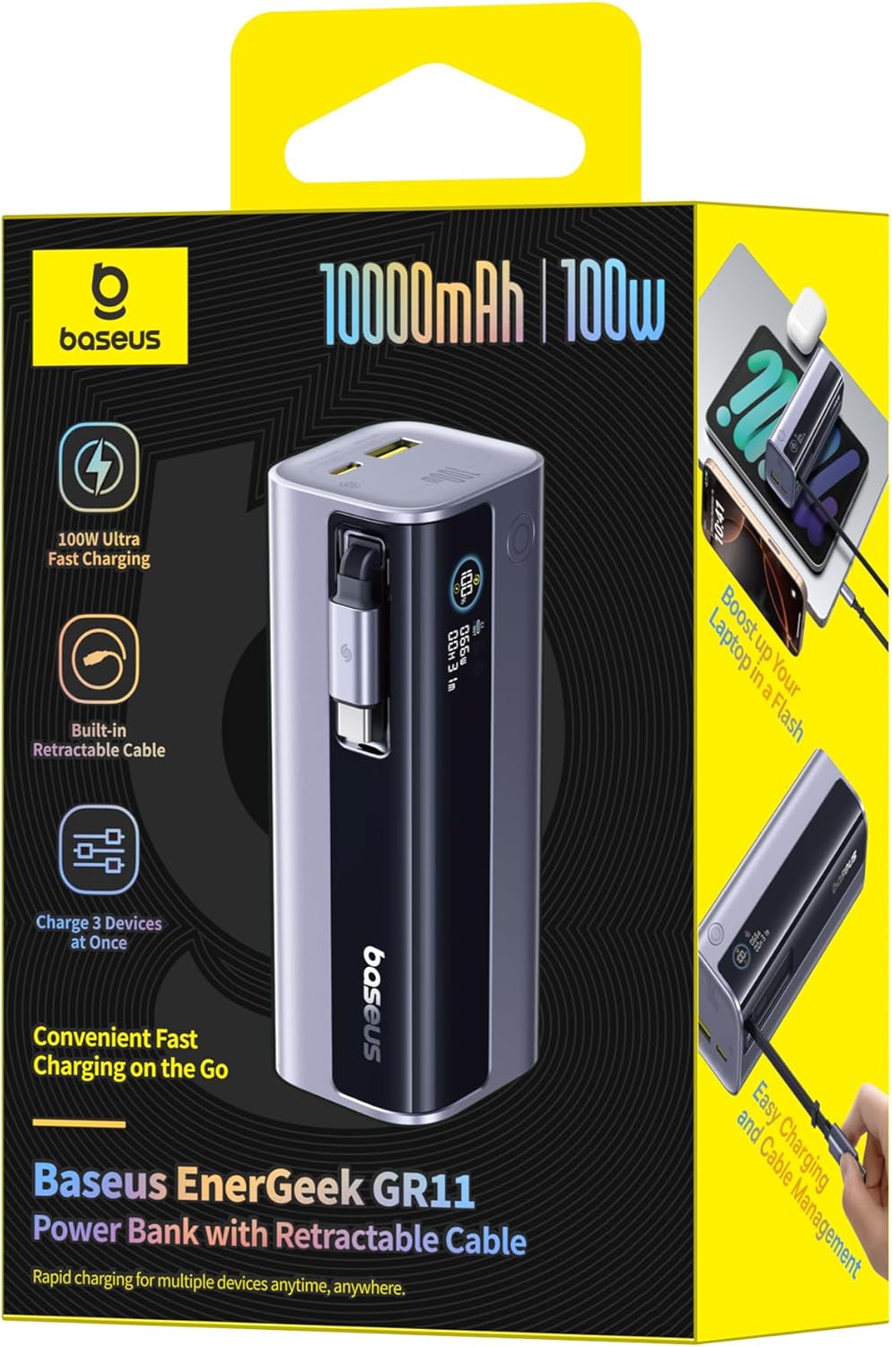 باور بانك بيسوس إنرجيك GR11 بسعة 10000 مللي أمبير 100 واط مع كابل قابل للسحب – رمادي