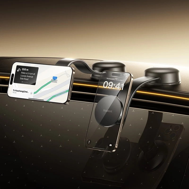 ثبت هاتفك بسهولة مع الحفاظ على تركيزك على الطريق باستخدام حامل السيارة المغناطيسي بيسوس برايم تريب C02، الذي يتميز بقاعدة كوب شفط قوية وقبضة مغناطيسية متينة باللون الأسود الكوني الأنيق.