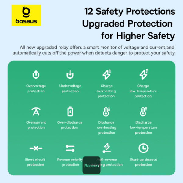 السلامة والأداء لكل موقف: تم تصميم مشغل القفز بيسوس برايم تريب مع 12 حماية أمان متقدمة، بما في ذلك الحماية من الشحن الزائد والقطبية العكسية. شاشة LED تعرض ضغط الإطارات والجهد في الوقت الفعلي.
