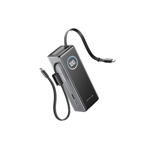 * **باور بانك متعدد الأجهزة:** منفذين USB-C، كابل USB-C قابل للسحب بطول 67 سم، كابل USB-C بطول 26 سم مع رباط.