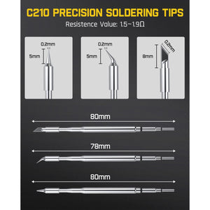 تم تجهيز فانتِك T1 MAX بـ 4 قطع من رؤوس اللحام C210 (C210-I، C210-IS، قطعتين C210-K) ذات التسخين السريع، وعمر خدمة طويل، ومقاومة للأكسدة. يمكنك تحقيق وقت تسخين/إعادة تسخين سريع، حيث أسرع وقت هو 7 ثوانٍ. وبالتالي، فإنه يقلل من وقت الانتظار ويحسن كفاءة مهام الإصلاح الخاصة بك. أيضًا، مع شفاط اللحام والملاقط الدقيقة، يمكنك تنفيذ مهام اللحام بسلاسة وأمان.