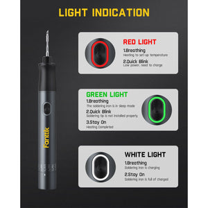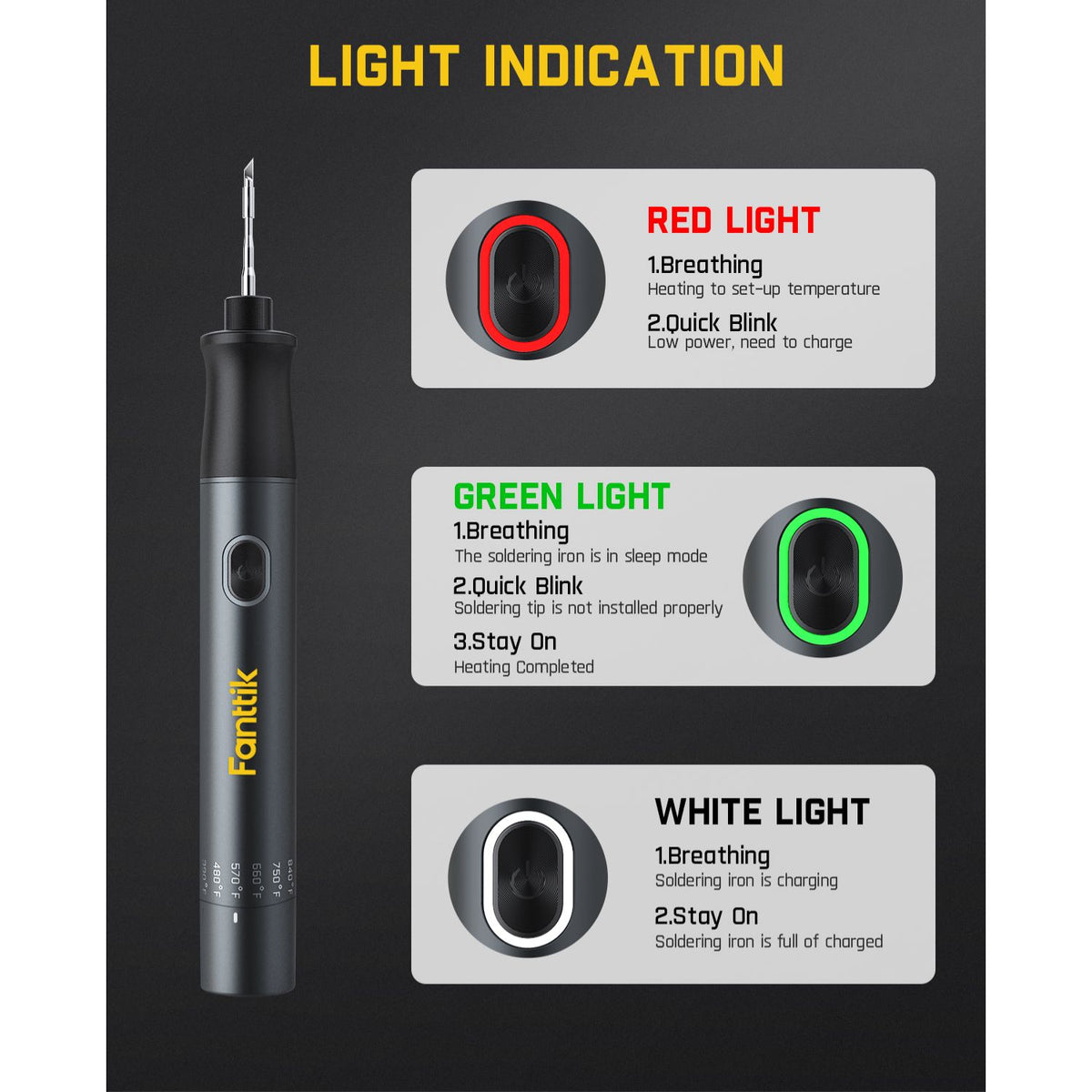 بعد التشغيل، ستدخل مكواة اللحام في وضع السكون إذا بقيت ثابتة لمدة 15 ثانية. سيعاد تشغيل فانتِك T1 MAX تلقائيًا للتسخين حتى درجة الحرارة التي قمت بتعيينها عند التقاطها مرة أخرى. ملاحظة: سيومض الضوء الأحمر عند التسخين، بينما يضيء الضوء الأخضر دائمًا عند الانتهاء من التسخين.