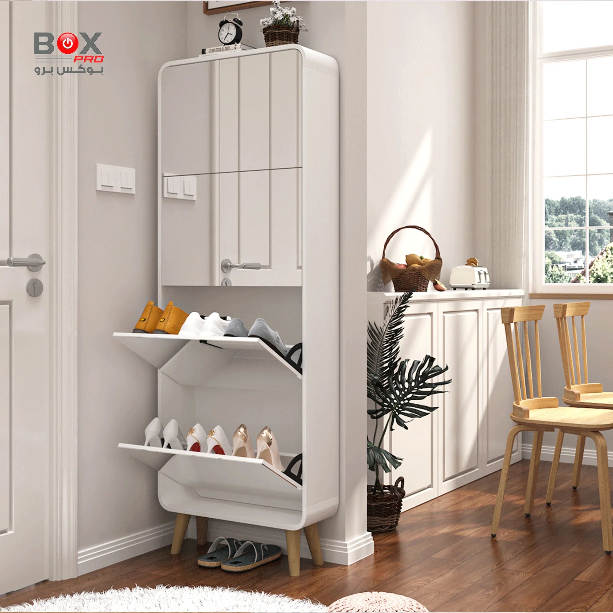 خزانة أحذية أربعة أدراج قابلة للفتح مع مرآة ورفوف قابلة للإزالة، خزانة تخزين أحذية بأرجل ثابتة، خزانة تنظيم أحذية بيضاء للمدخل وغرفة المعيشة