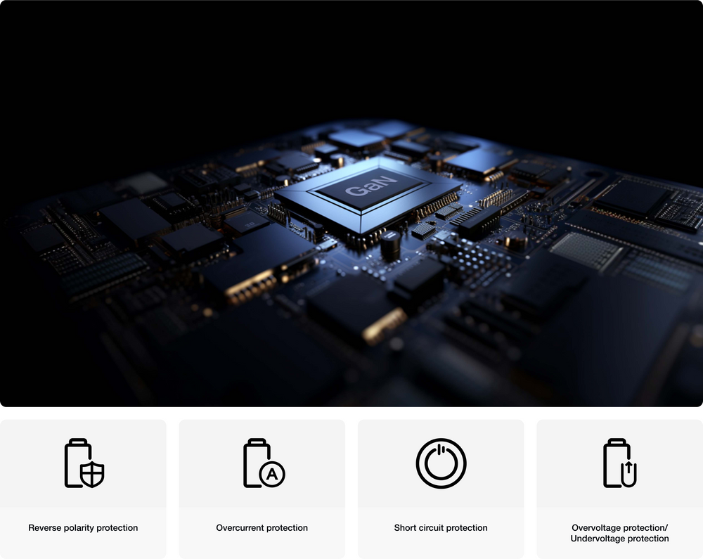 مع مقاومة حرارية عالية، تضمن تقنية نيتريد الغاليوم (GaN) شحناً آمناً في كل مرة. يوفر شاحن المولد 800 واط ميزات أمان متعددة، بما في ذلك الحماية من الجهد المنخفض التي تمنع الاستخدام المفرط للطاقة وتلف بطارية البدء. ضمان لمدة عامين يضمن تجربتك وراحة بالك.