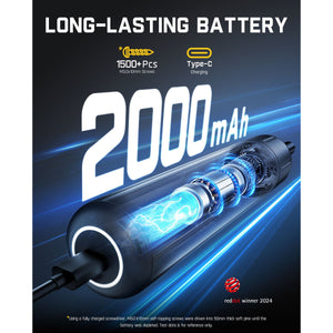 مُدمج ببطارية تدوم طويلًا بسعة 2000 مللي أمبير، ومُعتمدة لتشغيل ما يصل إلى 340 برغيًا (3.5*20 ملم) بشحنة كاملة. لا حاجة لإزالة المفك أثناء الشحن، ويوفر منفذ Type-C المواجه للخارج تجربة شحن مريحة. مؤشر طاقة موضوع بشكل بديهي في الأسفل يبقيك على اطلاع دائم.
