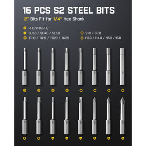 بفضل 16 لقمة مصنفة في 5 فئات، يمكنك الاستعداد لمجموعة متنوعة من أعمال الإصلاح. يضمن الفولاذ المُقسى S2 المطلي عمر خدمة طويلًا وآمنًا. أداة عالية الجودة لضمان عمل عالي الجودة.