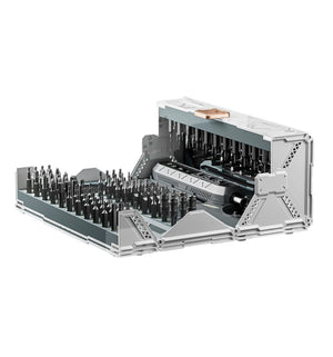 تصميم ذكي وعملي:يحتوي الطقم على علبة مغناطيسية عالية السعة تُدار يدويًا، تسهّل تخزين عدد كبير من رؤوس المفكات والإكسسوارات في مساحة محدودة.