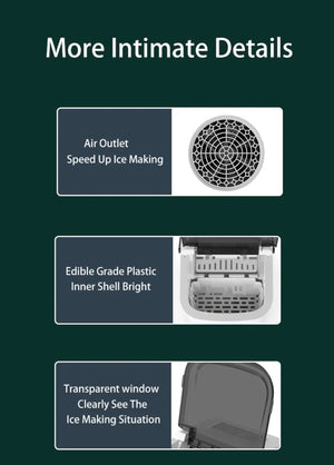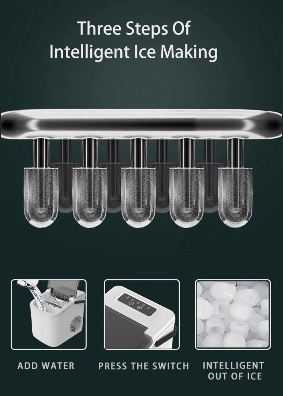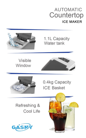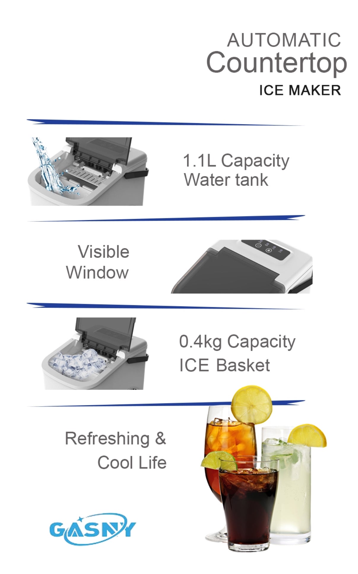 استمتع بالثلج المنعش في أي وقت مع صانعة الثلج الأوتوماتيكية GASNY .  مصممة لتكون مثالية للطاولات والمطابخ المنزلية أو أماكن العمل، وتنتج مكعبات ثلج على شكل رصاصة خلال دقائق فقط، مع إمكانية اختيار حجم الثلج بين صغير وكبير.