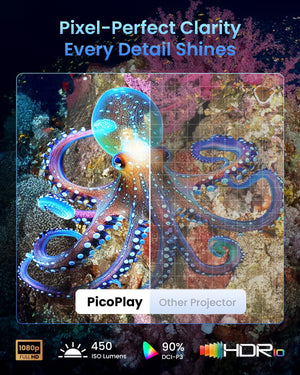 استمتع بصور مذهلة بسطوع 400 ISO لومن (بيكو بلاي: 400، بيكو بلاي+: 450)، وألوان 90% DCI-P3، ودقة 1080P واضحة — حتى شاشة ضخمة مقاس 200 بوصة.